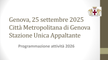 Le slides allegate si riferiscono all'incontro tra la SUA di Città Metropolitana di Genova e le Amministrazioni comunali del territorio, tenutosi giovedì 25 settembre 2025, nel corso del quale sono ste illustrate ai Comuni partecipanti le più rilevanti novità relativamente alla qualificazione delle Stazioni appaltanti (a seguito del correttivo al Codice appalti come aggiornato dal D.Lgs. 209/2024) e le iniziative di acquisto aggregate che la SUA di CM ha programmato per il 2026. Nel corso dell'incontro sono stati illustrati anche i modelli di Capitolato Speciale sia per gare relative a lavori che per gare attinenti l'affidamento di servizi.